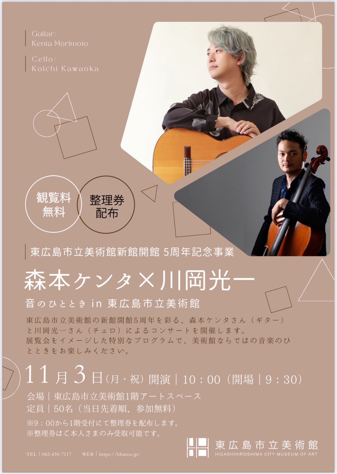 森本ケンタ×川岡光一 音のひととき in 東広島市立美術館 東広島市立美術館の新館開館5周年を彩る、 森本ケンタと川岡光一によるコンサートを開催 展覧会をイメージした特別なプログラムで、美術館ならではの音楽のひ とときをお楽しみください。 ●時間 開演|10:00(開場|9:30) ●会場 東広島市立美術館1階アートスペース ●定員 50名(当日先着順、参加無料) ※9:00から1階受付にて整理券を配布します。 ※整理券はご本人さまのみ受取可能です。 ●お問い合わせ TEL 082-430-7117 WEB https://hhmoa.jp/ 東広島市立美術館 HIGASHIHIROSHIMA CITY MUSEUM OF ART |