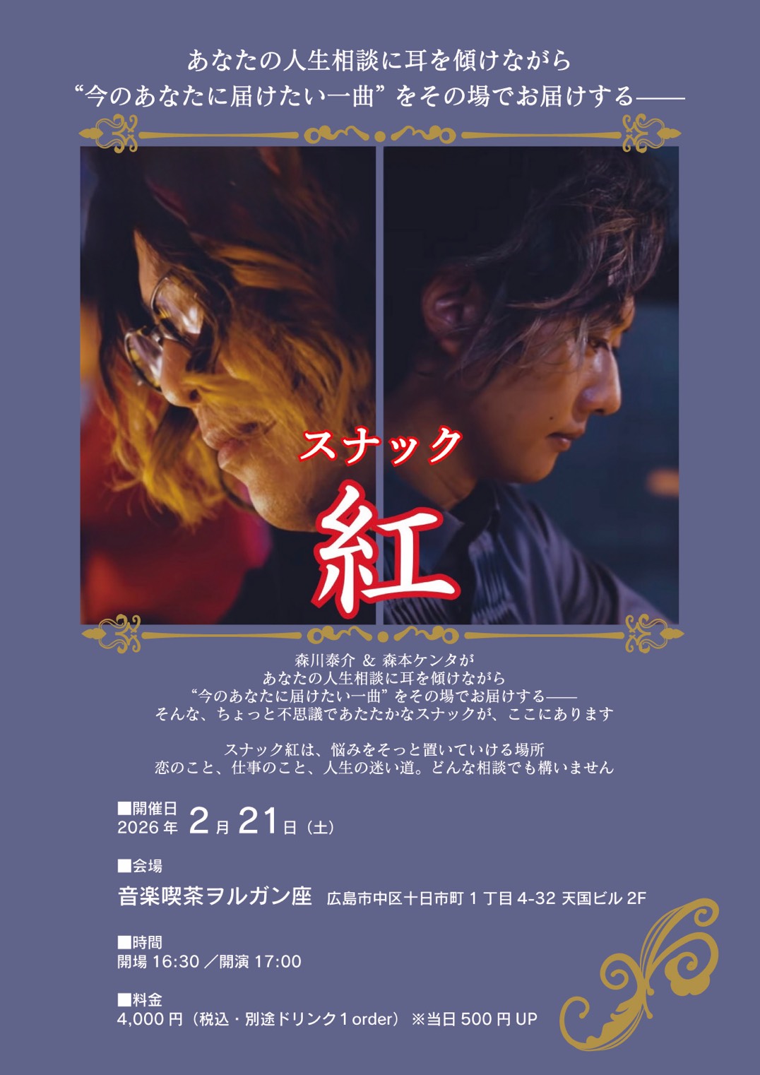 約2年ぶりの開催! スナック紅 season2 in ヲルガン座 ↓ご予約はこちら↓ https://tiget.net/events/455128 森川泰介 & 森本ケンタが、 あなたの人生相談に耳を傾けながら、 “今のあなたに届けたい一曲” をその場でお届けする—— そんな、ちょっと不思議であたたかなスナックがここにあります。 スナック紅は、 悩みをそっと置いていける場所。 恋のこと、仕事のこと、人生の迷い道—— どんな相談でも大丈夫です。 お申込み後に、メールにご相談専用フォームURLをお送りしますので フォームよりあなたのご相談をお寄せください(匿名可) 森川泰介と森本ケンタが、真摯に向き合い、言葉と音楽でお答えします。 ※ご相談がない方もご来場いただけます ●会場 音楽喫茶ヲルガン座 (広島市中区十日市町1丁目4−32 天国ビル 2階) ●チケット予約 https://tiget.net/events/455128 ●チケット代金 前売4,000円(別途1order) 当日チケット代金500円UP ※当日受付にてチケット代金をお支払いいただきます ※整理番号順にご入場いただきます ※自由席です |